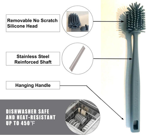 Alkaline Anytime Silicone 8.5" Bottle Brush, Hanging Handle, reinforced steel, great for Baby Bottles, Flasks, Glassware, Perfect for Small Bottles